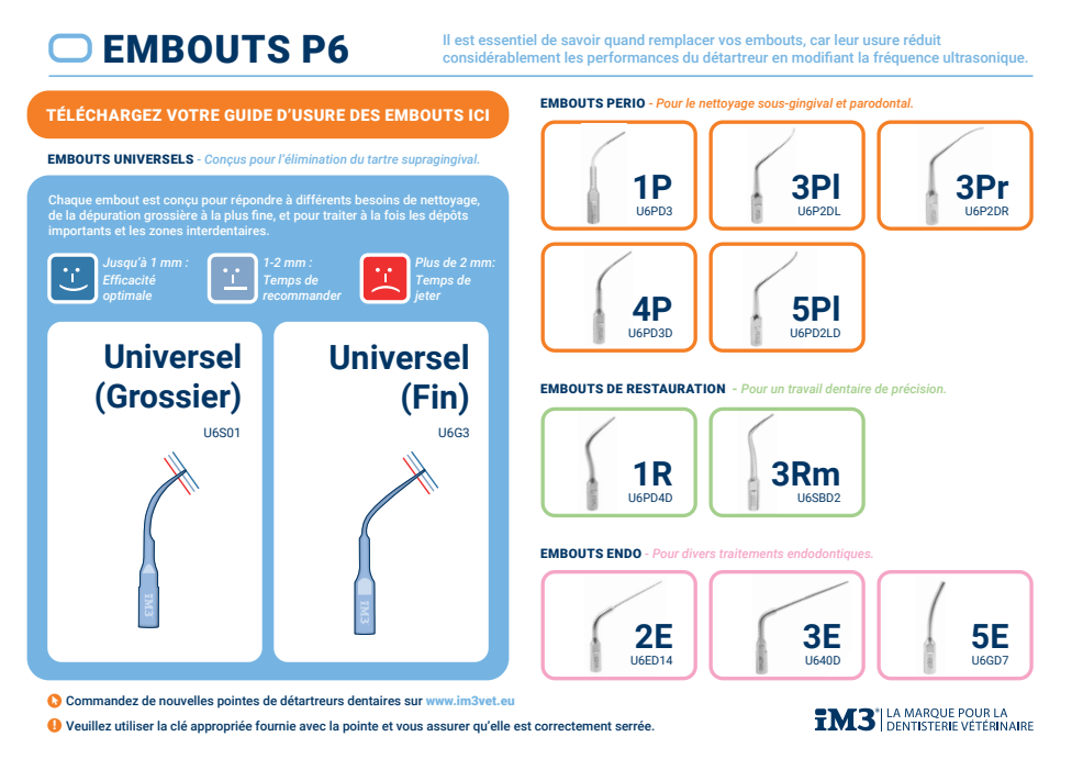 Si vous n'êtes pas sûr des embouts appropriés pour votre détartreur, n'hésitez pas à contacter iM3 ou votre distributeur local pour obtenir de l'aide. Contactez-nous par téléphone au +353 (0)1 691 1277 ou par email à sales@im3dental.com.