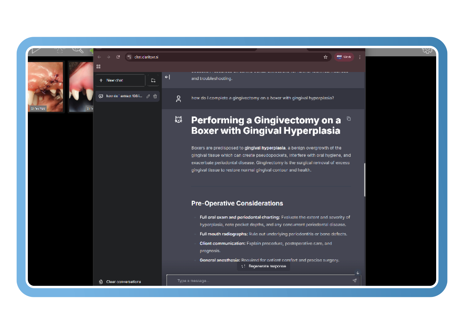 Le Clarity Question Lab répond aux questions cliniques et procédurales en s’appuyant sur les recommandations dentaires de la WSAVA et sur des publications évaluées par des pairs, rédigées par des vétérinaires spécialistes diplômés en dentisterie. Des explications instantanées, étape par étape, soutiennent l’apprentissage clinique et la cohérence des pratiques - transformant les cas du quotidien en véritables opportunités pédagogiques fondées sur les meilleures pratiques.